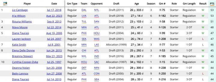 值得一提的是,布克斯的44分也高居WNBA历史单场得分榜并列第十位。